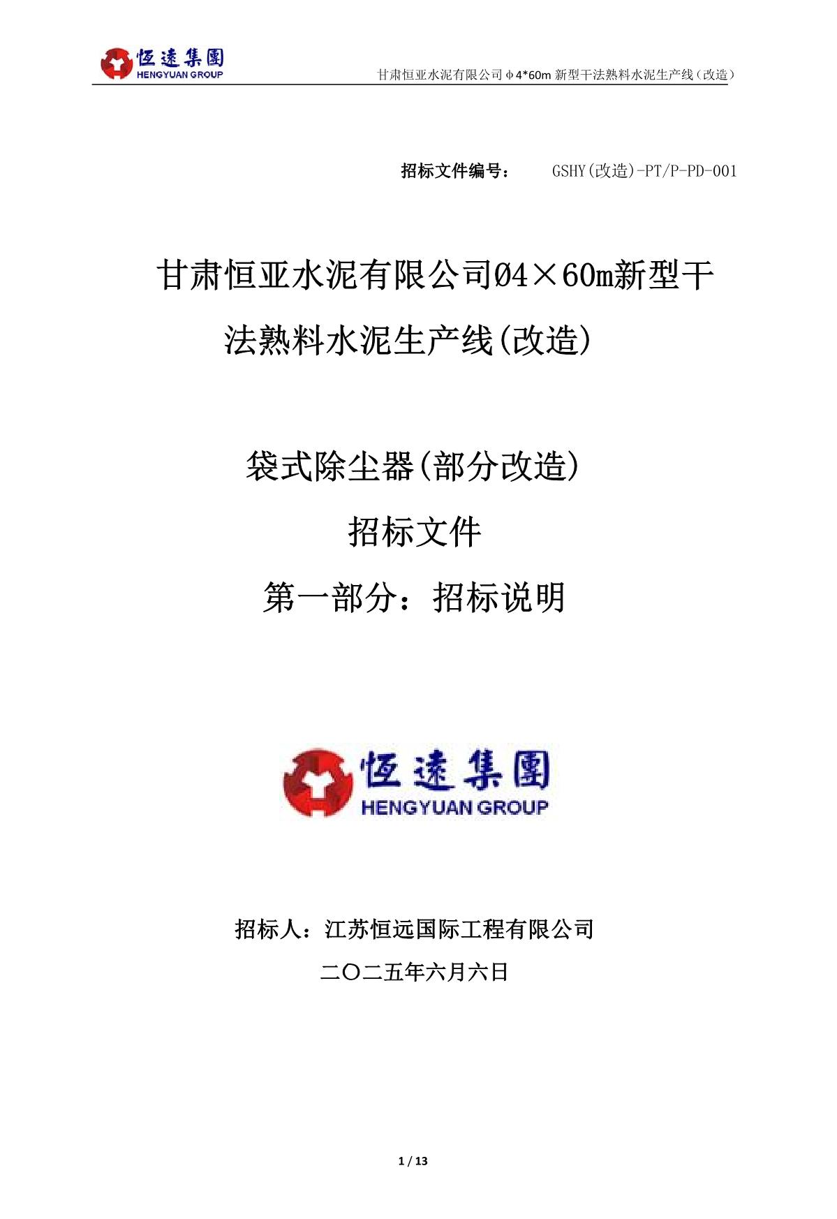 恒遠(yuǎn)集團(tuán)2025年6月6日甘肅恒亞水泥有限公司超低排放收塵器改造項(xiàng)目招標(biāo)